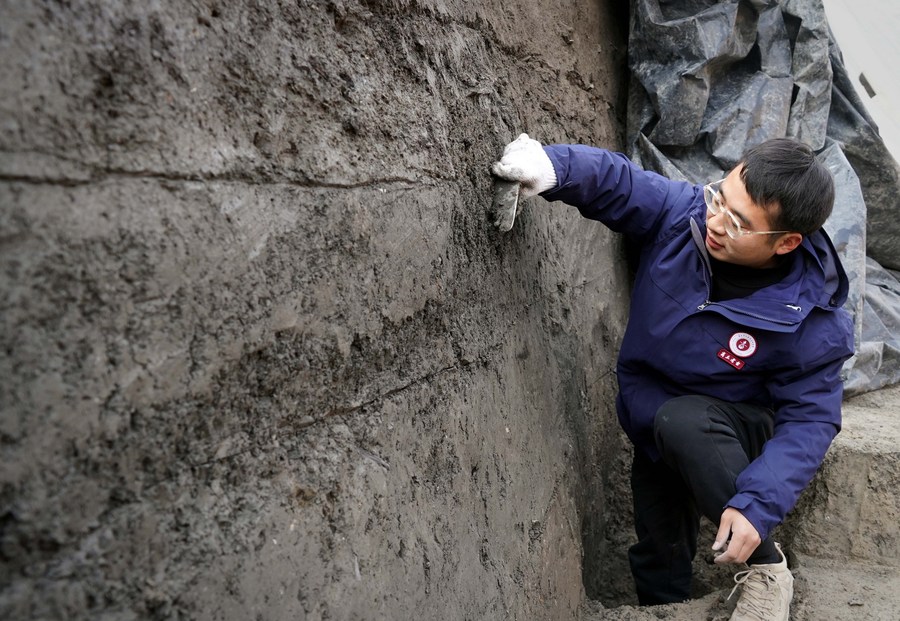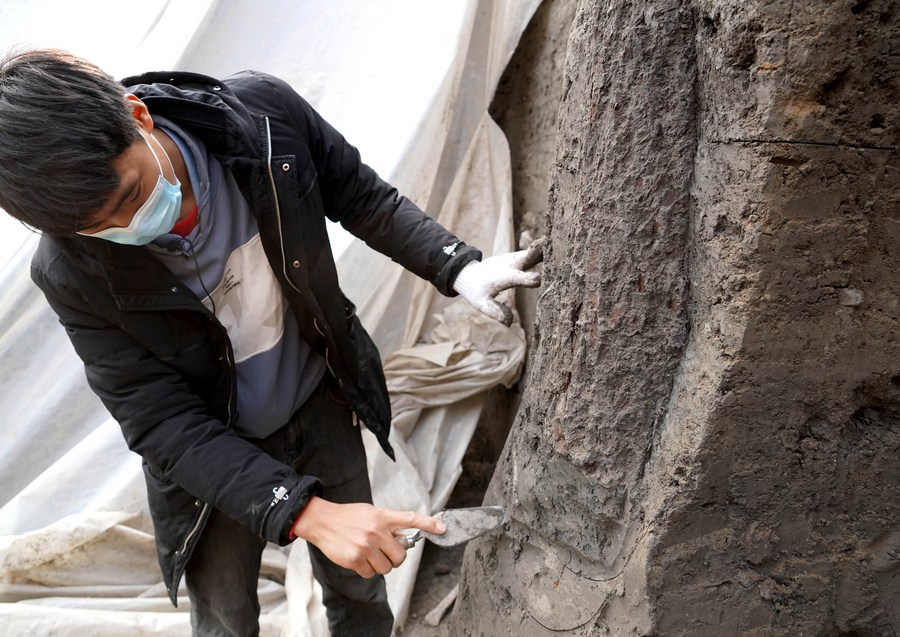 Seorang arkeolog bekerja di sebuah situs peninggalan di Shangqiu, Provinsi Henan, Tiongkok tengah, pada 6 Januari 2023. (Xinhua/Li An)