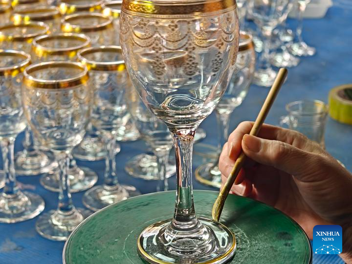 Foto ini, yang diambil dengan ponsel, menunjukkan seorang staf sedang mengecat garis emas di sekeliling kaki cangkir kaca di Kabupaten Qixian, Provinsi Shanxi, Tiongkok utara, 8 Januari 2026. (Xinhua/Wang Hao)